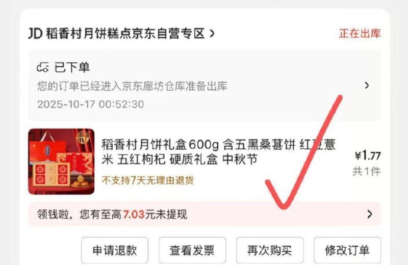 一起付款 退掉凑单 稻香村月饼600g 1.77拿下